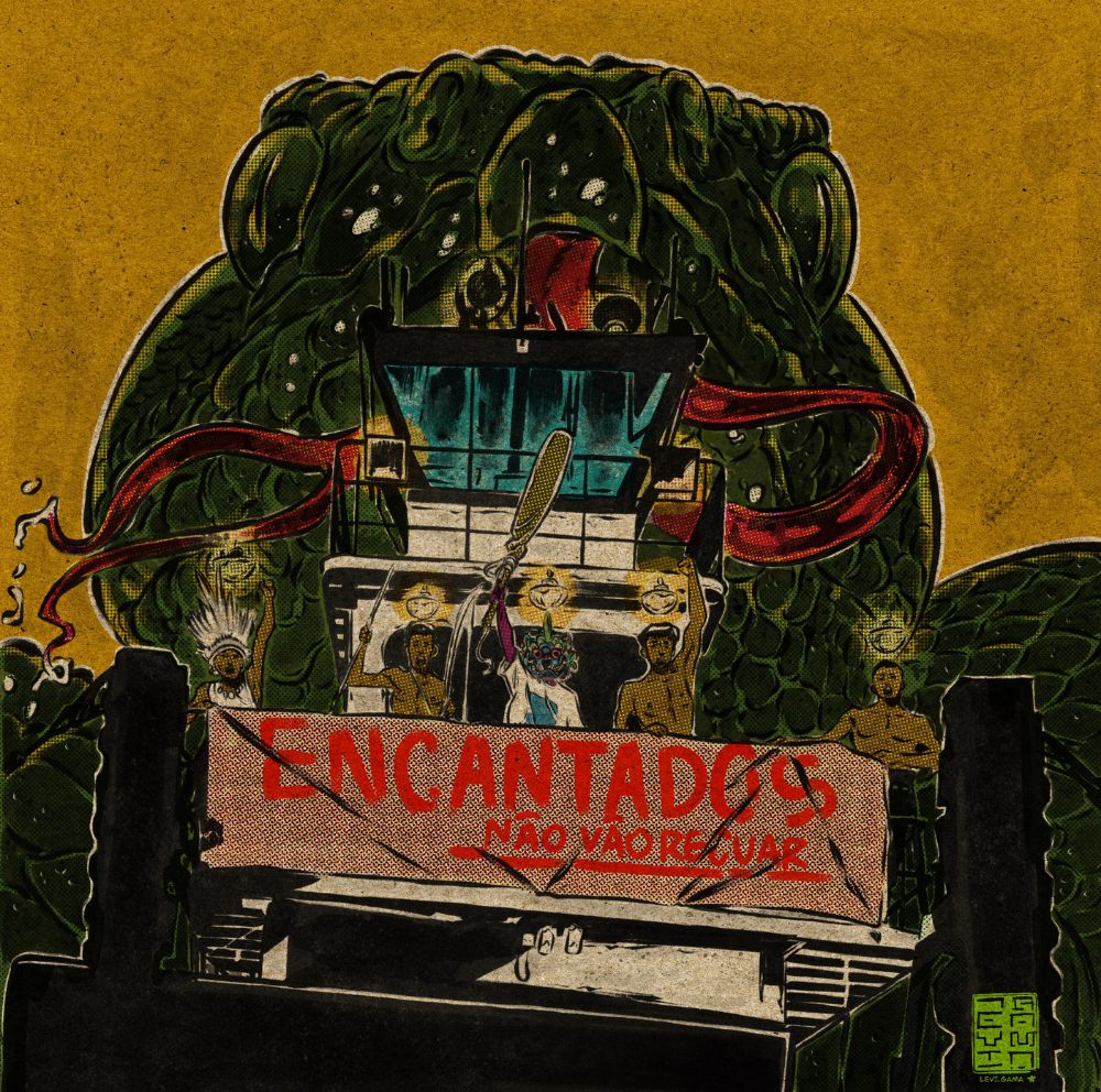Levi Gama convoca o imaginário amazônico ao afirmar que “encantados não vão recuar”. A ilustração conecta espiritualidade, território e resistência, reafirmando que o debate não é apenas econômico, mas também cultural e cosmológico.