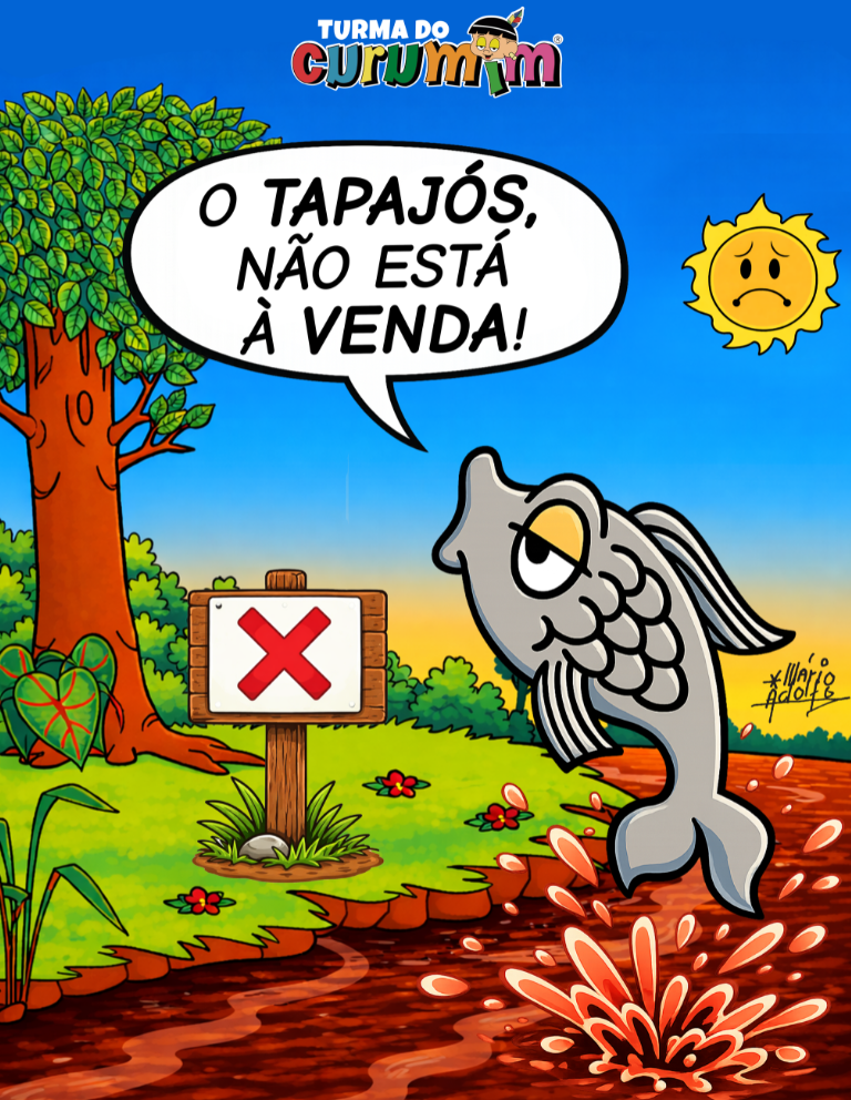 A obra coletiva afirma que os rios não são mercadorias. Em traços que dialogam com o universo infantojuvenil e com a cultura ribeirinha, os artistas transformam a denúncia em mensagem pedagógica: o Tapajós não está à venda.