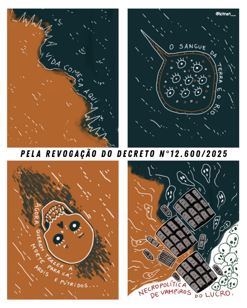 Cada artista interpreta, a seu modo, o impacto do Decreto 12.600/2025 sobre a soberania territorial, a preservação ambiental e os direitos dos povos tradicionais. As imagens reforçam o entendimento de que manter os rios vivos é preservar o equilíbrio climático, as histórias e os saberes que estruturam o tecido social amazônico .