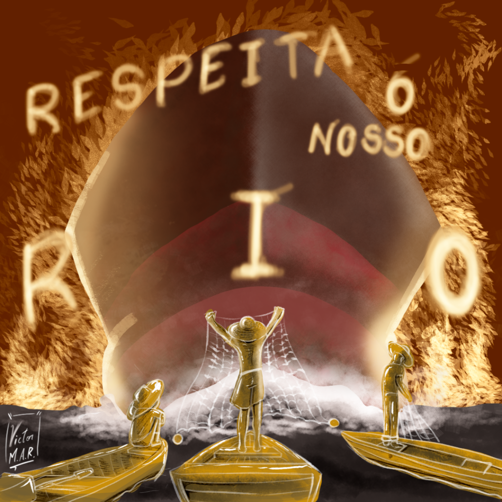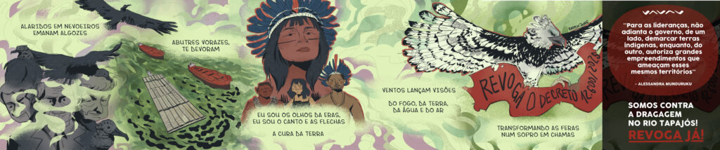 A artista Tai sintetiza a urgência da pauta em uma imagem vibrante que une elementos simbólicos da Amazônia e a frase direta: “Nossos rios são vida”. A obra afirma que suspender não é revogar, reforçando a reivindicação central do movimento. A força cromática e a presença de referências aos seres encantados traduzem visualmente o que as comunidades defendem nas margens do Tapajós.