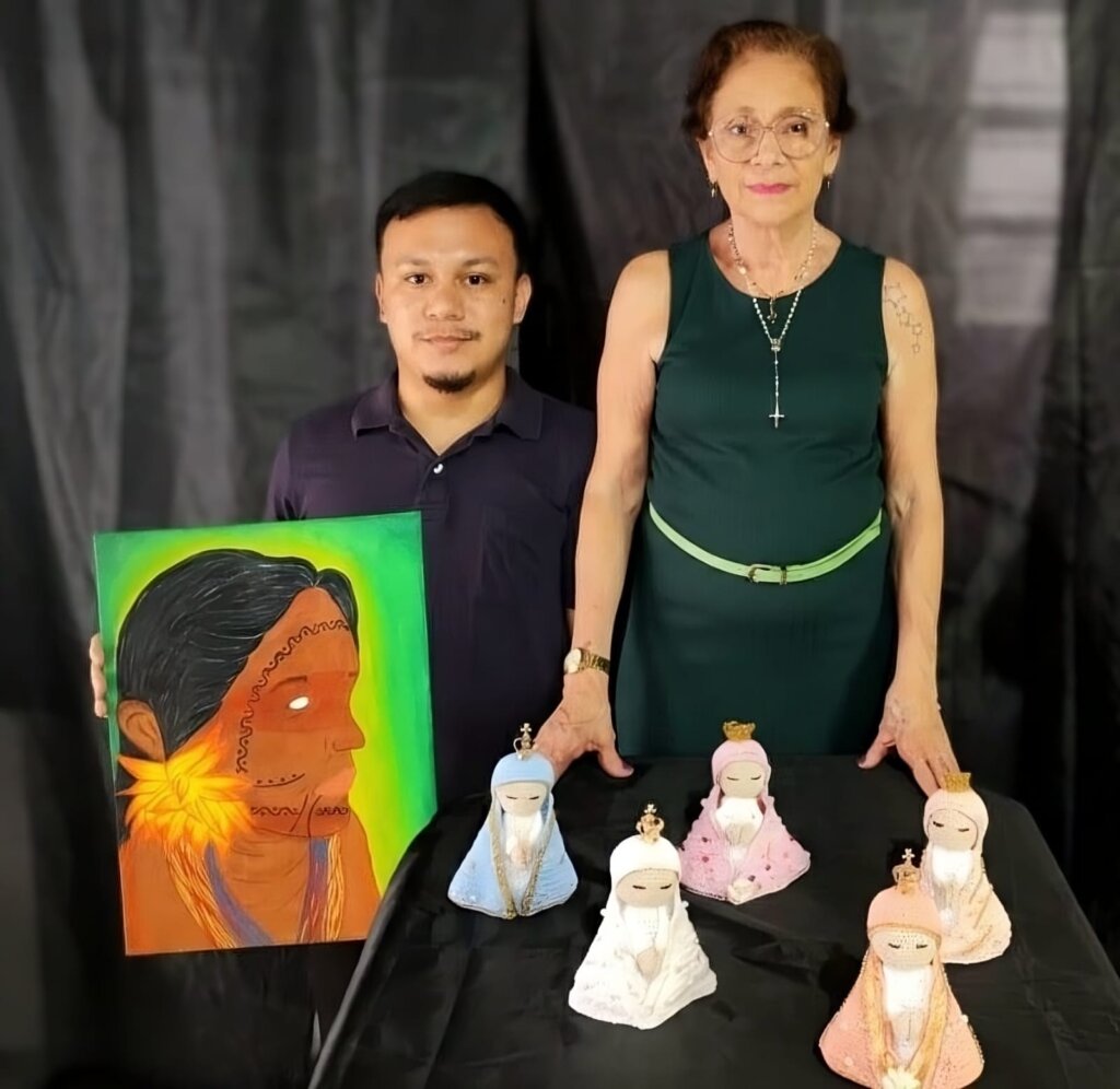 A artista plástica Lúcia Rassy, de 68 anos, apresenta 20 miniaturas em crochê de Nossa Senhora de Nazaré, cada uma com apenas 20cm. Devota desde a infância, ela define seu trabalho como uma oração materializada. “Cada pedacinho de crochê é uma oração. Aprendi essa técnica com a minha mãe e hoje compartilho com as novas gerações. É uma forma de manter viva a tradição e a minha fé, afirma Lúcia.