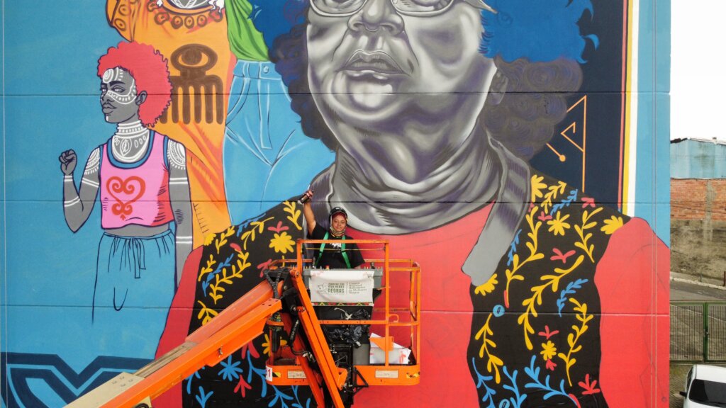 A artista posicionou a frase no topo do painel como forma de homenagear a ativista em vida e reforçar a importância de reconhecer as referências do movimento negro enquanto seguem atuantes. “É uma afirmação da continuidade de nossos passos, da oralidade, do empoderamento, da união e da luta”, completa.